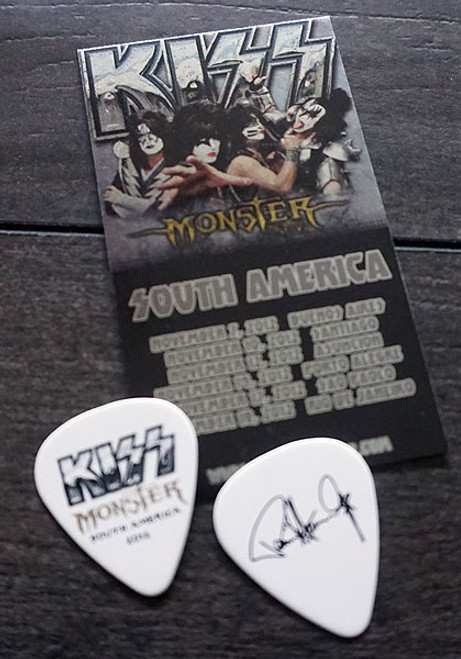 These KISS Monster logo guitar picks feature the Monster logo in color and text South America 2012 on one side and band member signature on the other side.  You will receive one pick with collectible card.